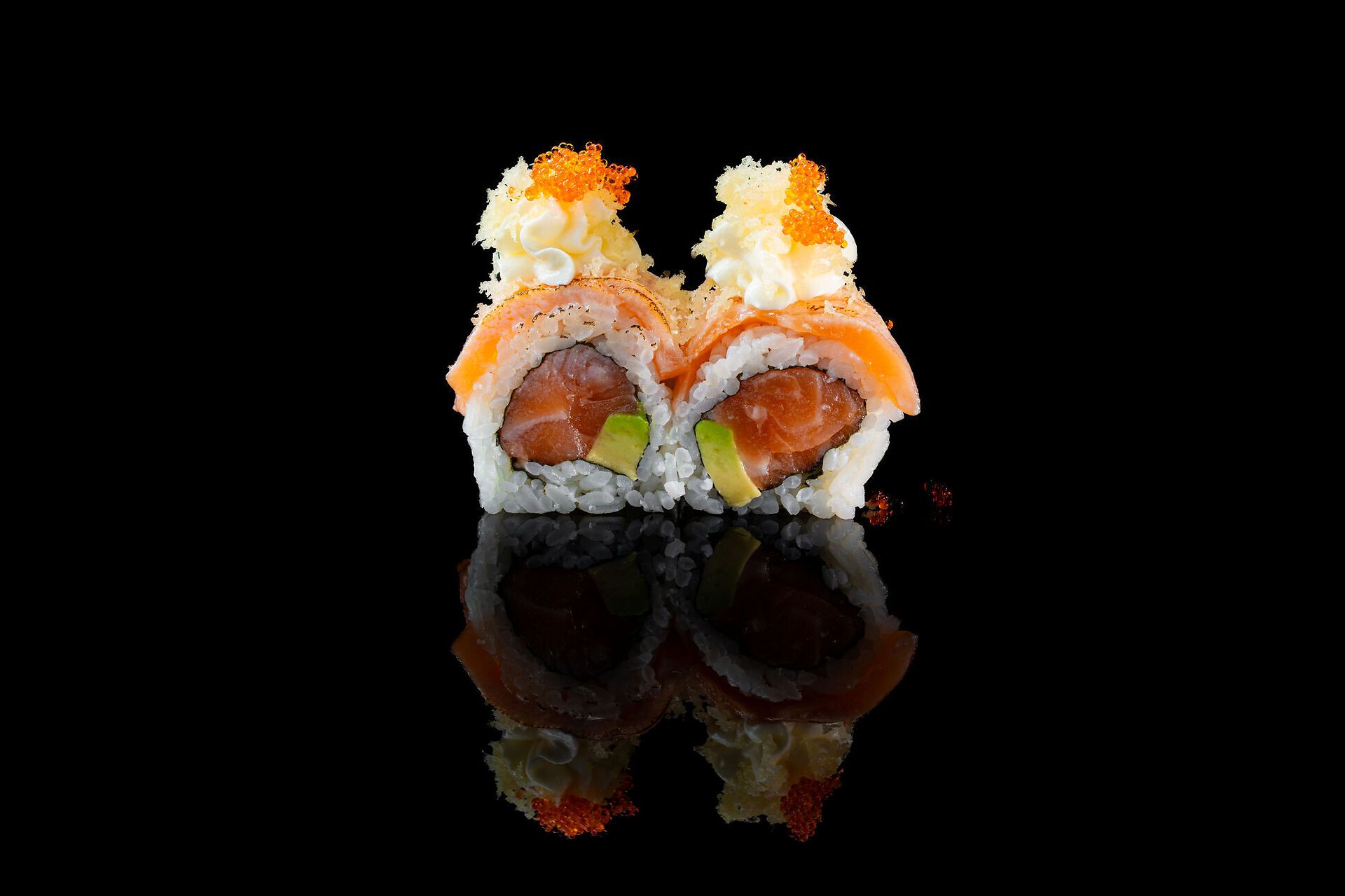 Salmone crudo, philadelphia, avocado, salmone scottato, tobiko e kataifi