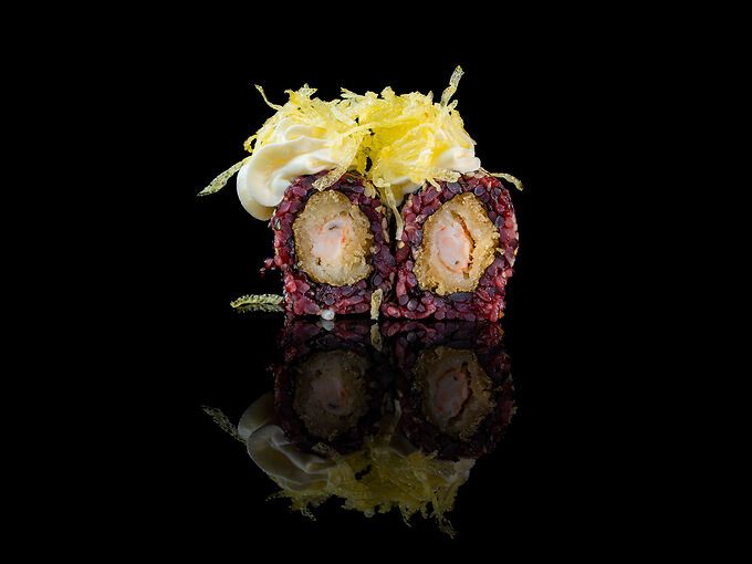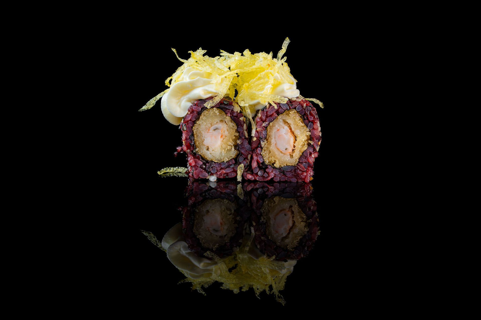 Riso nero, tempura di gamberi, philadelphia e patate fritte