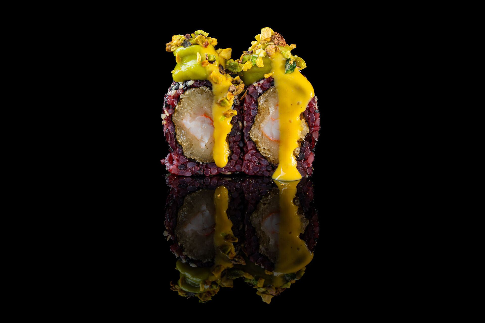 Gamberi fritto, salsa avocado, salsa mango, pistachio e sesamo