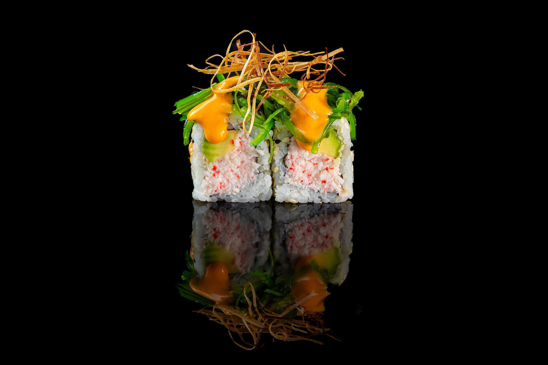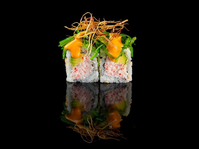 Granchio di surimi, avocado, goma wakame, porri fritti e salsa spicy