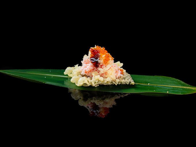 Alga con surimi di granchio, philadelphia, tobiko e Tempura