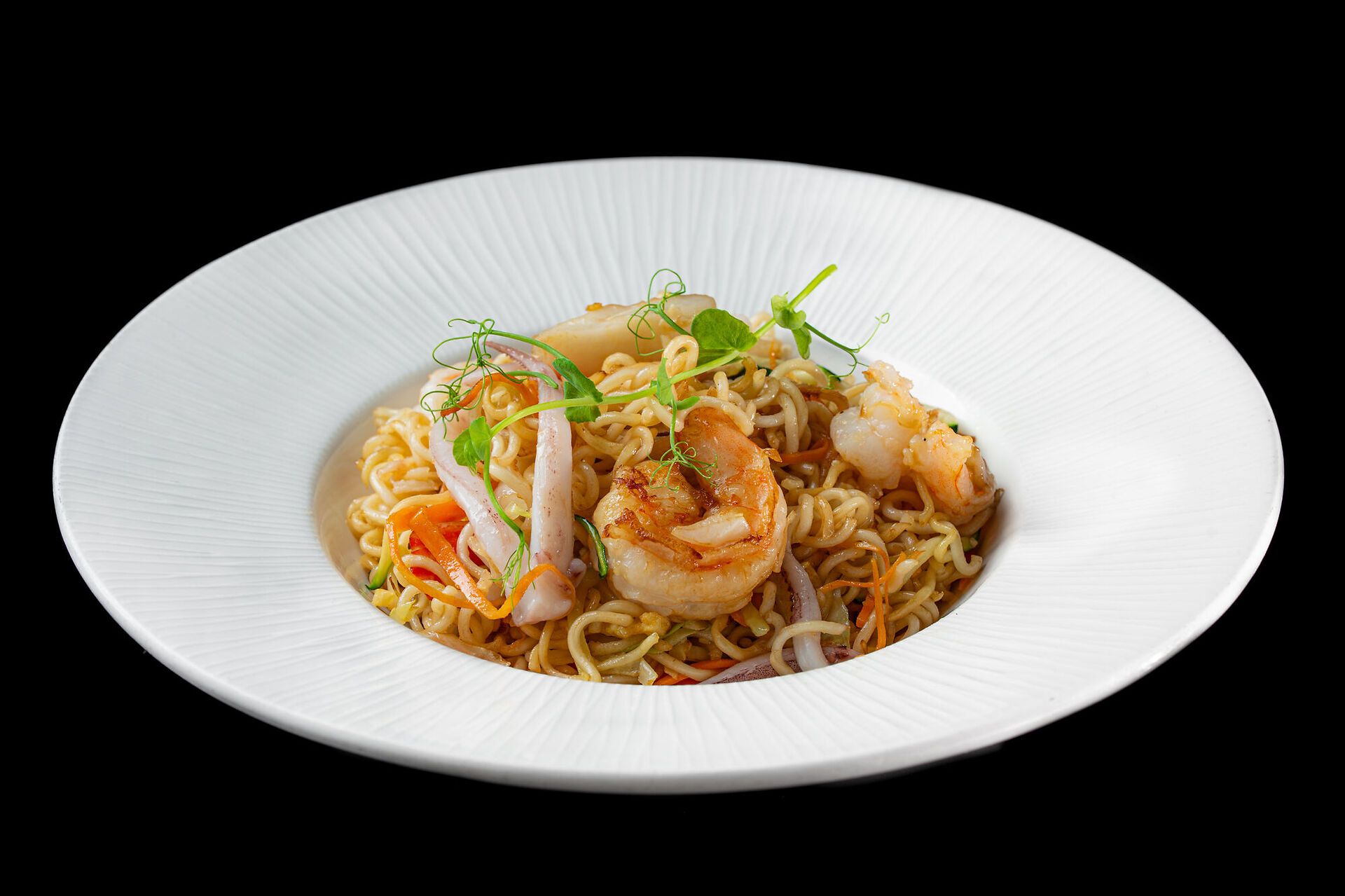 Noodles saltati con gamberi (mazzancolle), calamari, surimi, verdure miste e uovo
